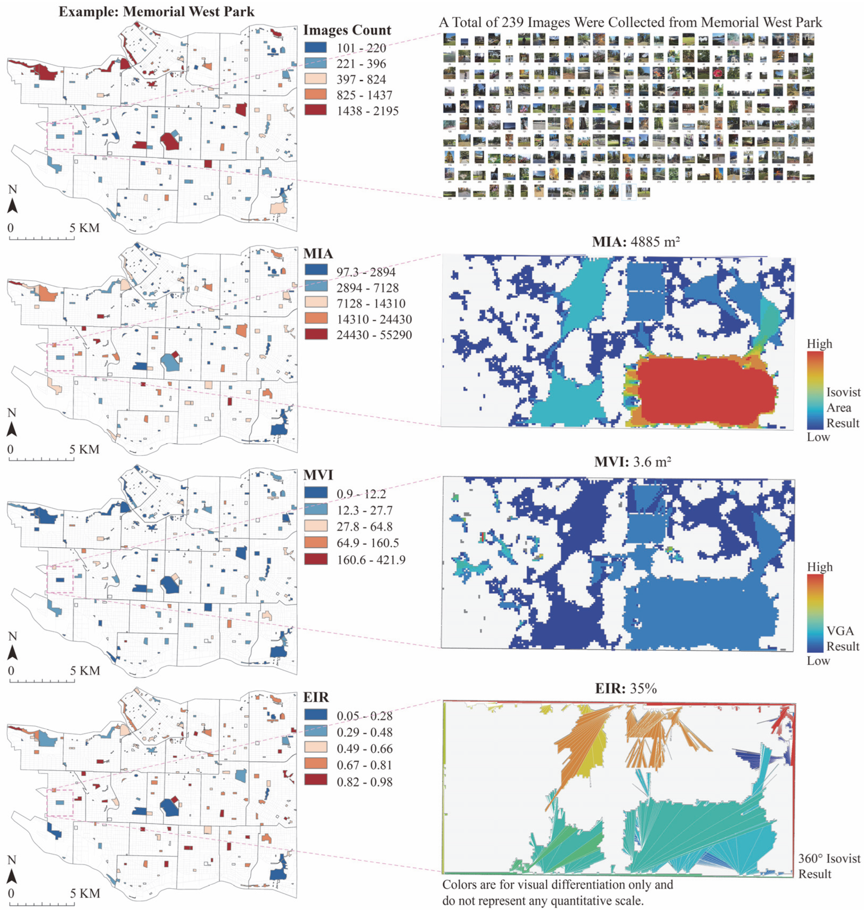 Figure 4 presents the distribution of citywide image counts and the three spatial visibility metrics, MIA, MVI, and EIR, across Vancouver’s 148 urban parks. The top panel displays the number of user-generated images for each park, highlighting an example park with its associated images. The remaining three panels illustrate the corresponding spatial metrics for that park: MIA indicates average local visual openness, MVI reflects overall spatial integration, and EIR measures boundary-level visual permeability. The maps and diagrams offer an overview of how user engagement and visibility characteristics are spatially distributed, serving as a reference for the upcoming statistical analyses.