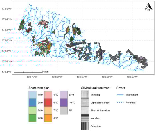 The study was conducted in stands 118 and 119 (Figure 1) of cutting area 8 for the year 2022, located at the geographic coordinates 17° 37′ 27′′ LN, 100° 37′ 12′′ LW; altitude 2046 m above sea level; physiographic province XII Sierra Madre del Sur; subprovince 66 Cordillera Costa del Sur; and topographic system 100 Sierra, according to the physiographic map scale 1:1,000,000 [29]. The soil consists of extrusive igneous rock and lithological unit intermediate andesite-tuff (geological map 1:250,000). Climate C (W2) temperate subhumid with rainfall in summer and higher humidity (climate map 1:1,000,000). Vegetation: pine forest and pine–oak forest. Hydrological region: 19 A Tecpan River Sub-basin [29].