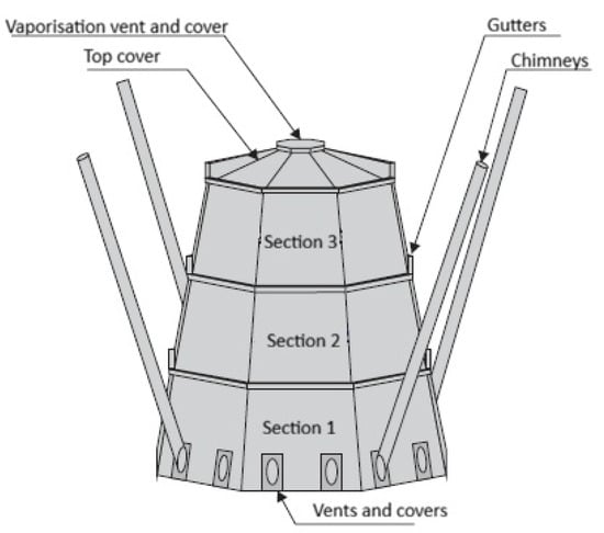 The charcoal was produced in a portable octagonal metal furnace of the Guadiana Valley Experimental Field (CEVAG) type, consisting of three octagonal sections that can be assembled one on top of the other (upper, middle, and low sections). It has sixteen vents with covers, two on each side of the octagon in section 1, as well as a top cover with ventilation for moisture vaporisation. It also has four tubes or chimneys (Figure 2). The oven has a capacity of 3000 to 3200 kg per load, which yields 500 to 600 kg of charcoal. The use of this oven represents an accessible technological improvement, greater efficiency in the pyrolysis process, better product quality, and portability for areas with limited access in the mountains of Guerrero, allowing carbonisation to be carried out on site near the biomass source, thereby reducing transportation costs. The process was in accordance with [30]. During the pyrolysis process, gases are released, and the air intake is controlled by manually operated dampers in the chimneys located at the bottom of the furnace. Total airtightness is achieved by closing the air intakes at the bottom, and the process is carried out by managing the oxygen intake to achieve controlled combustion [31]. It should be noted that, during the carbonisation process, it was not possible to record temperature readings that would allow for a thermal profile to be generated.