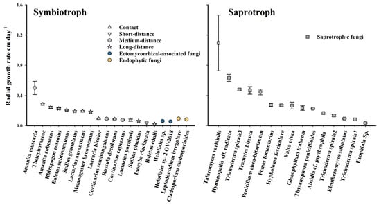 Maximum values of radial growth rate (cm day−1) at 22 °C for ectomycorrhizal fungi (including contact, short-distance, medium-distance, and long-distance exploration types), ectomycorrhizal-associated fungi, endophyte fungi, and saprotrophic fungi. Bars show the standard error.