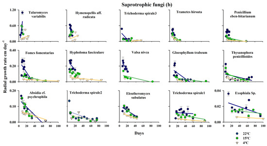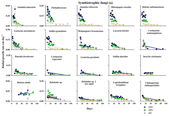 To determine the effect of the temperature on the radial growth rate, individually for each fungal isolate, a linear regression analysis was performed (Table S2). Generally, the radial growth expansion decreased with time, except for the two taxa with the highest growth rates Amanita muscaria and Talaromyces variabilis, which showed a constant increase in growth rate over time, until the edge of the Petri dish was reached. The equation of linear regression models generally indicated a negative correlation between radial growth rate and incubation time at 22, 15, and 4 °C.