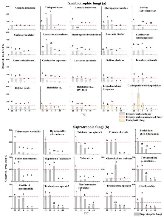 Observed/predicted percentage (%) of triphenyltetrazolium chloride (TTC) reduction by symbiotrophic fungi (a) and saprotrophic fungi (b) after exposure to different temperatures. Different letters represent a statistically significant difference (p < 0.05). The error bars represent the standard errors of the mean values. The dashed red line shows 100%.