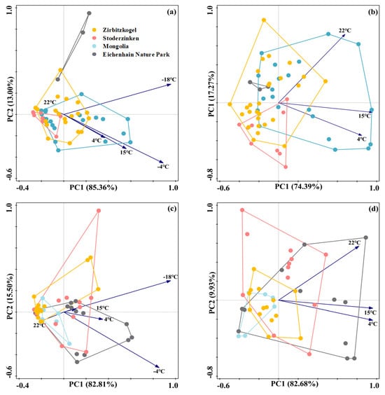 In all plots, PC1 explained a significant proportion of the variance, ranging from 74.4% to 85.4%, while PC2 accounts for smaller but relevant variability, ranging from 13.0% to 17.3%. Symbiotrophic fungi (Figure 4a,b) showed tighter clustering at lower temperatures (4 °C and −18 °C), whereas saprotrophic fungi (Figure 4c,d) exhibited more dispersed patterns, suggesting a greater variation in response to temperature. Similarly, the different locations exhibited variations in patterns of response to temperature. Tighter clustering was shown for Stoderzinken and Eichenhain, but no clear separation was shown for any of the source sites.