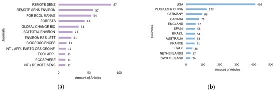 Further analysis of the search results (Figure 3) revealed that nearly 200 journals published research on remote sensing of forest tree mortality between 1998 and the first half of 2024. The open-access journal Remote Sensing, published by MDPI, ranked first, with nearly 90 publications. It is highly favored due to its short review cycle and fast publication speed. Following it is the well-established Remote Sensing of Environment, which focuses on remote sensing and environmental studies, with a particular emphasis on tree mortality. The journals Forest Ecology and Management and Forests were ranked third and fourth, respectively, as these journals focus on forests and forest management, leading to a significant amount of research on tree mortality. The United States led in publication volume, with over 400 papers, accounting for nearly half of the total publications. This is closely linked to the research contributions from institutions such as the United States Department of Agriculture (USDA) and the United States Forest Service. China ranked second, with over 100 papers, largely from the Chinese Academy of Sciences. Germany and Canada have lower publication volumes but still contribute notable research.