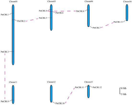 Based on the genome annotation information of P. trichocarpa, the 13 PtrCBL genes were distributed across seven distinct chromosomes. Three PtrCBL genes were located on each of Chromosome 1 and Chromosome 3. Two PtrCBLs were positioned on each of Chromosome 6 and Chromosome 12. PtrCBL9 was situated on Chromosome 11, PtrCBL10 on Chromosome 12, and PtrCBL13 on Chromosome 16 (Figure 1).