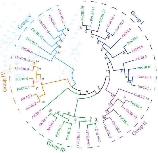 The analysis of homologous genes provides a foundation for exploring gene functions. The phylogenetic analysis revealed that the PtrCBL genes could be categorized into five subfamilies (Group I–V). Each subgroup exhibited uneven distribution in terms of member count. Group I contained the largest number of PtrCBL members (PtrCBL1, 6, 10, 11, and 12). PtrCBL4 and 8 were located in Group II, while PtrCBL2 and 5 were found in Group III. Group IV comprised two PtrCBL genes, including PtrCBL3 and 9. Both PtrCBL7 and 13 were grouped in Group V (Figure 2). It is well established that proteins with closer genetic relationships often exhibit similar or closely related biological functions. Furthermore, the majority of PtrCBL proteins clustered with the CBL proteins in Glycine max. This clustering pattern suggests that the PtrCBL proteins have a closer genetic relationship with their homologous counterparts in Glycine max compared to those in Arabidopsis thaliana.