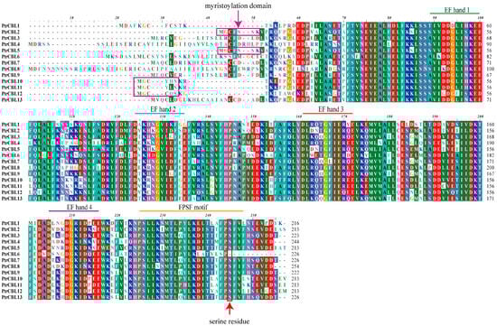 The multiple sequence alignment of PtrCBLs in P. trichocarpa. The different EF-hand domains are marked by different colored lines. The magenta frame tagged the myristoylation domain.