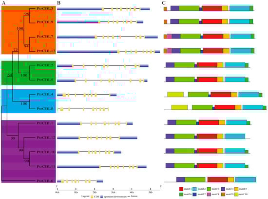 Gene structure of PtrCBLs. (A) Phylogenetic tree within PtrCBLs in P. trichocarpa. The different background color represents the subgroup. (B) The exon–intron structure analysis of PtrCBLs. (C) The conserved motifs in PtrCBL proteins. MEME website was used to identify the conserved motifs. Modules in different colors represent different motifs.