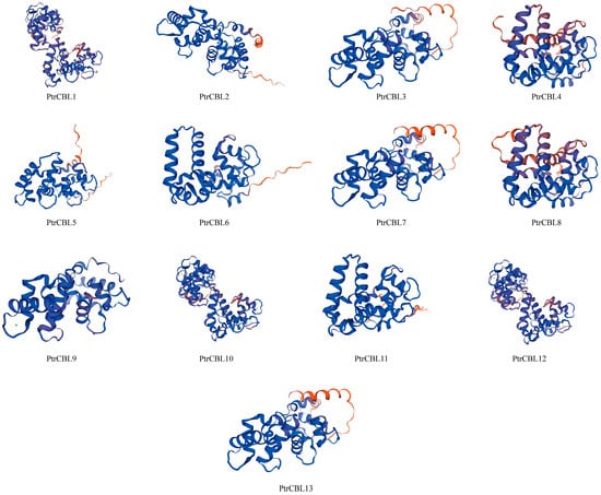 The tertiary structure of PtrCBL proteins was analyzed using Swiss-Model online platform. The results revealed diverse protein tertiary structures among the 13 PtrCBL members. Notable differences in PtrCBL tertiary structures were observed, likely related to structural elements, including α-helices, β-sheets, and random coils. The similarities and differences in tertiary structures may explain the functional similarities or differences exhibited among proteins. Importantly, homologous gene pairs such as PtrCBL2-PtrCBL5, PtrCBL3-PtrCBL9, PtrCBL4-PtrCBL8, PtrCBL7-PtrCBL13, and PtrCBL10-PtrCBL11 displayed highly similar protein tertiary structures, suggesting functional redundancy among these pairs (Figure 6).