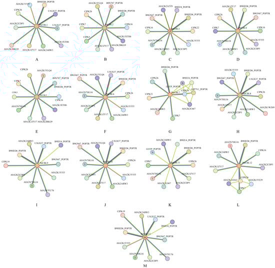 We utilized the STRING website to predict potential interacting proteins for PtrCBLs. The analysis revealed that all PtrCBL proteins possessed interacting protein networks, suggesting that PtrCBL members can interact with other proteins in response to plant hormone treatments and environmental stresses, as well as participate in growth and development processes in P. trichocarpa. Furthermore, PtrCBL1, 3, 4, 6, 8, 9, 10, and 13 exhibited similar interacting proteins, indicating the presence of conserved interaction domains within the PtrCBL protein (Figure 7). Previous research has demonstrated that CBL proteins can specifically bind to CBL-interacting protein kinases (CIPK) to form CBL-CIPK protein complexes. These complexes participate in the Ca2+ signal transduction pathway, enabling plants to respond to various internal and external signals [41]. Our results indicated that all PtrCBL proteins interact with different CIPK proteins, suggesting that this interaction exists in P. trichocarpa to facilitate growth, development, and abiotic stress resistance.
