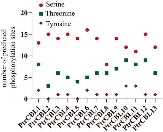 Prior research has demonstrated that CBL proteins can undergo phosphorylation by CIPK proteins [42]. Consequently, we predicted potential phosphorylation sites in PtrCBL proteins, focusing primarily on serine, threonine, and tyrosine sites. As illustrated in Figure 8, all PtrCBL proteins contained serine phosphorylation sites, albeit in varying numbers. For instance, PtrCBL2 and PtrCBL12 exhibited fifteen serine sites each, followed by PtrCBL3, 5, and 9, which possessed fourteen serine sites. PtrCBL8 displayed the fewest serine sites, with only eight. PtrCBL10 and PtrCBL12 contained the highest number of threonine sites. The PtrCBL protein with the least serine sites was PtrCBL2, containing only three. With the exception of PtrCBL2 and PtrCBL5, all PtrCBL proteins contained tyrosine sites, though most PtrCBL proteins only exhibited one to three tyrosine sites.