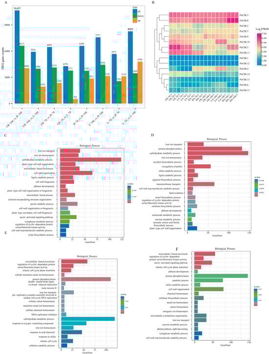 Differentially expressed genes (DEGs) in the leaves of P. simonii × P. nigra under alkaline stress. (A) DEGs statistics of RNA-seq in P. simonii × P. nigra under alkaline stress. Different colored bars represent the number of up-regulated, down-regulated, and total DEGs in the transcriptome. (B) Heatmap of the expression profiles of 13 PsnCBL genes under alkaline stress using RNA-seq data. The different colored boxes indicate different log2 (FPKM) values, with expression gradually increasing from blue to yellow to red over time. (C) The biological process at 7 d under low-concentration alkaline stress. (D) The biological process at 7 d under high-concentration alkaline stress. (E) The biological process at 14 d under low-concentration alkaline stress. (F) The biological process at 14 d under high-concentration alkaline stress.