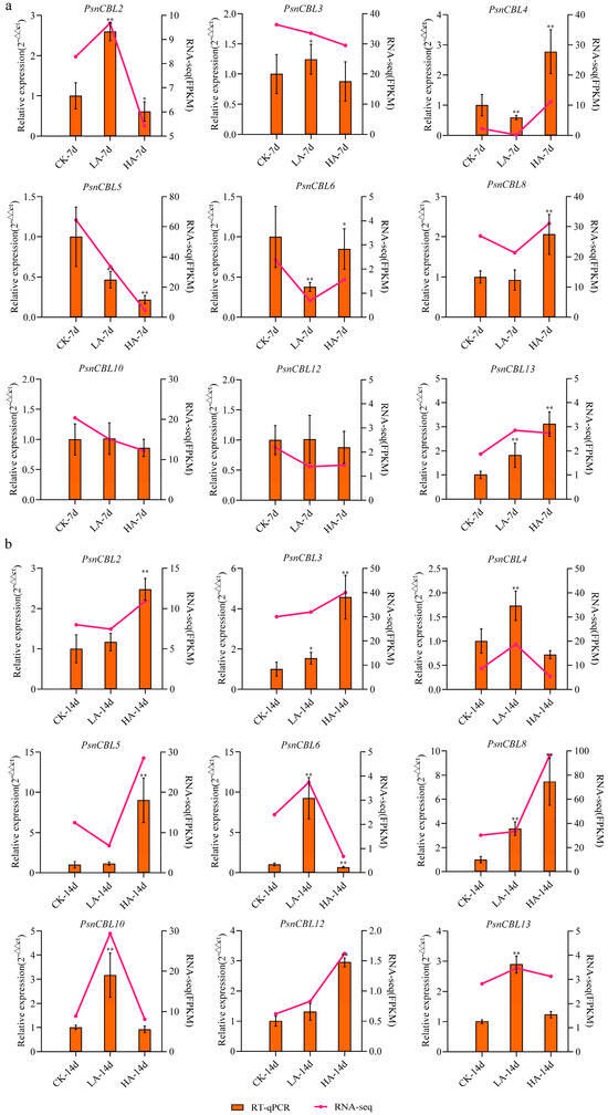 To validate the transcriptome data reliability, RT-qPCR was employed to access the expression of nine PsnCBLs (PsnCBL2, 3, 4, 5, 6, 8, 10, 12, and 13) with relatively high FPKM values in the transcriptome data. The evaluation revealed that the expression trends of these genes were generally consistent with the transcript abundance changes in the transcriptome data, confirming its reliability (Figure 10a,b). Further analysis under low-concentration alkaline stress showed significant up-regulation of PsnCBL3 and PsnCBL15 at 7 d and 14 d. PsnCBL4 and PsnCBL6 were markedly down-regulated at 7 d and dramatically up-regulated at 14 d. PsnCBL2 exhibited significant up-regulation at 7 d and slight up-regulation at 14 d. PsnCBL5 was significantly down-regulated at 7 d and slightly up-regulated at 14 d. PsnCBL8 and PsnCBL10 showed significant up-regulation at 14 d, while PsnCBL12 was slightly up-regulated at both 7 d and 14 d. Under high-concentration alkaline stress, only PsnCBL8 was consistently up-regulated at 7 d and 14 d. PsnCBL2 and PsnCBL5 were significantly down-regulated at 7 d and remarkably up-regulated at 14 d. PsnCBL4 and PsnCBL13 were significantly up-regulated at 7 d, with PsnCBL4 slightly down-regulated and PsnCBL13 slightly up-regulated at 14 d. PsnCBL3 and PsnCBL12 showed significant up-regulation at 14 d, while PsnCBL10 was slightly down-regulated at both 7 d and 14 d (Figure 10a,b).