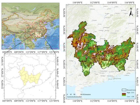 The study area (shown in Figure 1) was the Nanling Corridor (108°47′ E–116°38′ E, 29°01′ N–22°37′ N) in Southern China. Nanling is a mountainous region connecting Jiangxi Province and Hunan Province with the two southern provinces (Guangxi and Guangdong). It is connected to the Wuyi Mountains in the east, the Yunnan–Guizhou Plateau in the west, the Luoxiao Mountains in the north, and the JiuLian Mountains in the south [27]. The Nanling area is characterized by the fragmentation of the mountains and the changes in their orientations due to many orogenic movements, which has led to mountains without connecting veins. The basins in the western part of the South Ridge are mostly composed of limestone, forming karst landforms; the basins in the eastern part of the South Ridge are mostly composed of red gravel, forming Danxia landforms through weathering and erosion [28] (Figure 1).