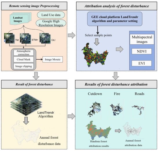 The aim is to analyze forest disturbance changes and their driving factors in the study area using multi-temporal remote sensing imagery and ground validation. The specific work flow is shown in Figure 2. (1) Study Area Definition and Data Collection: The remote sensing data from the Google Earth Engine (GEE) platform will be utilized to access Landsat cloud-free imagery from 2001 to 2020 [34]. The data will undergo preprocessing, including radiometric calibration, cloud detection, and cloud removal, to ensure the quality of the imagery. (2) Disturbance Detection and Sample Construction: The Landsat disturbance and recovery trend detection algorithm (LandTrendr) will be applied to analyze the multi-temporal remote sensing imagery, extracting the timing, intensity, and recovery trends of forest disturbances in the study area. In addition, visual interpretation will be conducted to validate the disturbance detection results. Sample points will be selected, and a validation dataset will be created through random sampling to assess the accuracy of the LandTrendr results. (3) Analysis of Disturbance Driving Factors: Based on the disturbance detection results, random forest algorithms will be used to analyze the driving factors of forest disturbances. Major factors such as forest fires, deforestation, and man-made road and building construction were selected to analyze forest disturbance because of its destructive effect on forest ecosystems and its high correlation with natural and man-made drivers. Ground survey data, along with remote sensing analysis, will be used to explore the correlation between vegetation changes and disturbance factors in the Nanling region, identifying the main influencing factors. (4) Data Analysis: The spatiotemporal distribution and trends of forest disturbance will be analyzed, assessing differences in disturbance intensity and recovery processes across different regions and time periods. Based on the analysis results, the mechanisms by which human activities and natural factors influence forest vegetation in the Nanling Corridor will be explored, providing scientific support for forest management and decision-making in the study area.