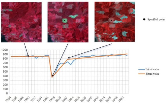 Before conducting this analysis, we used the LT-GEE Pixel Time Series to retrieve the NDVI for a specific point from 20 June to 20 September each year between 1984 and 2021, generating a line graph to assess whether the NDVI data accurately reflected vegetation disturbances (Figure 3). The NDVI at this point was relatively flat from 1984 to 1996. It reached a low value in 1997, trended upward from 1998 to 2003, and leveled off from 2004 to 2021 [45]. The obtained NDVI data were explored by comparing them with high-resolution images of the point and its surroundings from Google, and, in 1990, the point and its surroundings were covered with vegetation, so the NDVI was higher that year. The vegetation cover at and near this point decreased in 1997, so the NDVI values were low at this time. In 2003, the vegetation at and near the point recovered but did not reach the level of vegetation cover in 1990. The NDVI was higher in 2003 than in 1997 but not as high as in 1990. These results show that using the NDVI to study vegetation disturbance is justified [46].