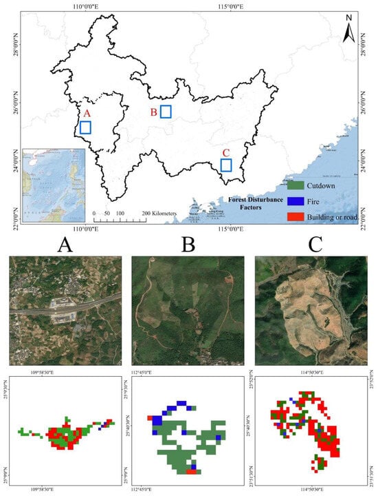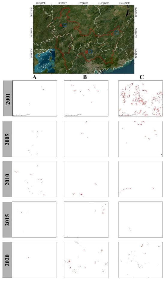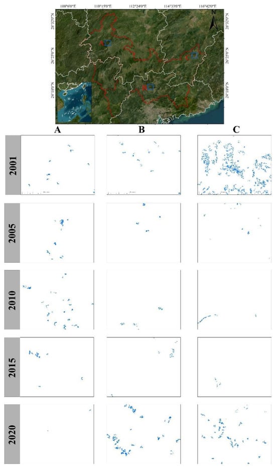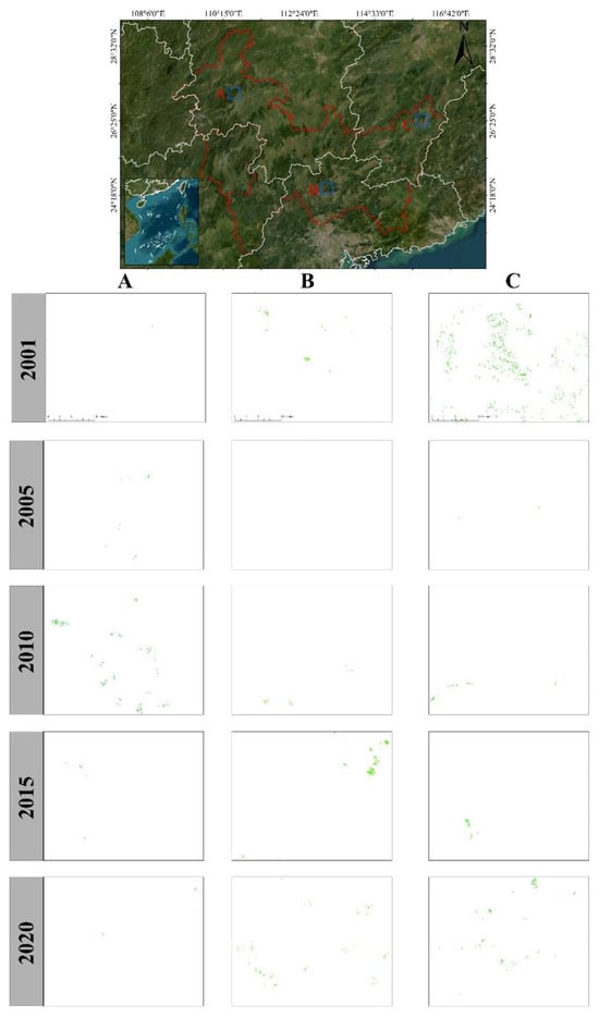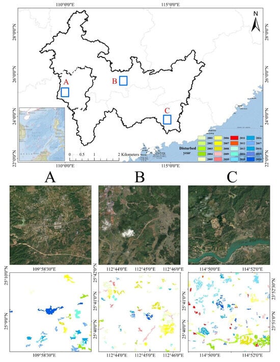 Spatiotemporal distribution pattern of forest disturbance in Nanling Corridor from 2001 to 2020. A, B, and C are comparisons between Google imagery of 2020 and forest disturbance monitoring results from 2001 to 2020 in three detailed areas of the study area, respectively.