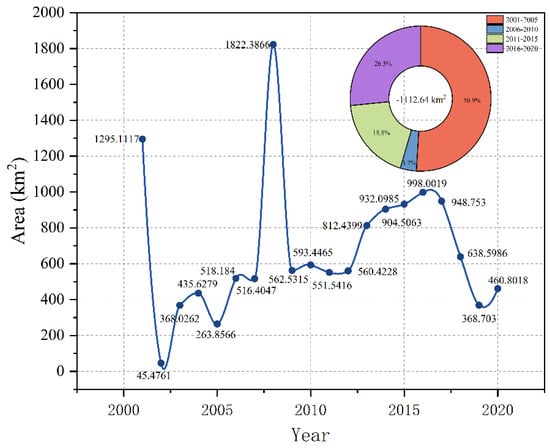 The areas and proportions of forest disturbance factors from 2001 to 2020.