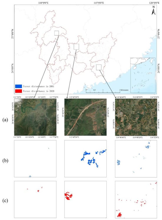 Columnar map of forest disturbance area from 2001 to 2020. (a) shows an image of Google Earth in 2020 for a typical area of the study area; (b,c) are the results of forest disturbances monitored in 2001 and 2020, respectively, for the corresponding locations.