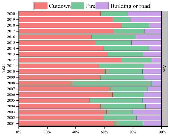 Percentages of forest disturbance factor areas from 2001 to 2020.