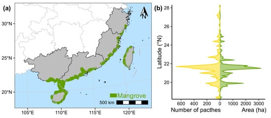 Spatial distribution of mangroves along the southern coast of China in 2018. (a) A map illustrates the spatial distribution of mangroves. (b) Graph depicting the variation in mangrove area and the number of patches, summarized across 0.1° latitudinal intervals.