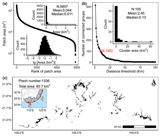 Distribution patterns of mangrove area at patch scale and local aggregation scale. (a) Relationship between patch area and rank order of patch area; the inset in the upper right displays the original distribution of patch areas, while the subplot in the lower left shows the distribution after log-transformation. Notes on the number of patches (N), mean, and median are included. (b) Relationship between the number of connected groups and the distance threshold, with a red mark indicating the distance threshold of 9 km chosen for this study, which resulted in 105 connected groups; the histogram in the upper right displays the distribution of areas for these 105 connected groups. (c) Map illustrating the largest connected group among the 105 identified groups, annotated with patch number and total area. A map with pentagram marks its geographical location.