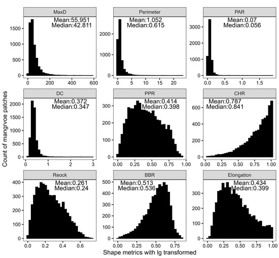 Overall, the MC2018 dataset includes 5857 valid mangrove patches. The distribution of patch areas is highly concentrated below 0.1 km2, with an average area of 0.044 km2 and a median of 0.011 km2. After log transformation, the area distribution of the patches approaches a symmetric bell-shaped curve (see Figure 2a). Among the 105 local mangrove areas aggregated using a 9 km threshold, the area distribution is also highly concentrated, with an average area of 2.45 km2 and a median of 0.13 km2, with one region having the largest area of 60.7 km2 (see Figure 2b,c). The largest local aggregation (Figure 2c) is currently designated as two national nature reserves and a provincial nature reserve (www.china-mangrove.org (accessed on 24 September 2024)). In addition to the patch area, four out of the nine other geometric metrics (DC, MaxD, PAR, and Perimeter) also exhibit highly concentrated distributions, with medians greater than the means (Figure 3). The other five shape-related metrics (BBR, CHR, Elongation, PPR, and Reock) each display varying degrees of skewness (Figure 3).