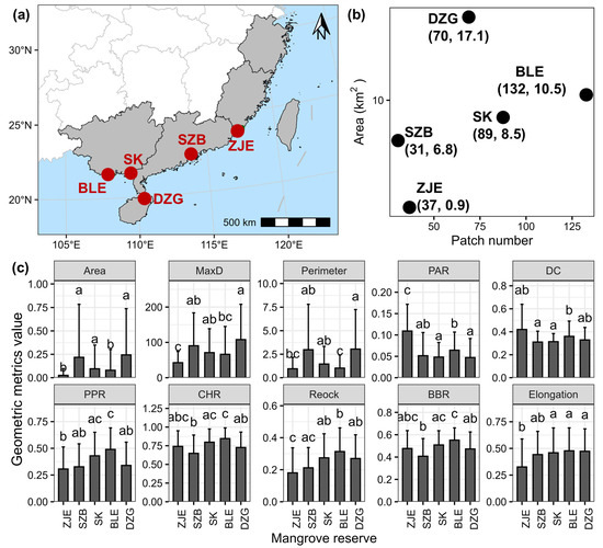 Comparison of geometric metrics across five selected national nature reserves or internationally important wetlands. (a) Locations of the five selected sites. (b) The relationship between the total mangrove area and number of patches in each reserve. (c) Differences in 10 metrics among the five sites. Different letters denote significant differences at the 0.05 level, based on a non-parametric test. The error bars represent one standard deviation. ZJE: Zhangjiang Estuary Mangrove National Nature Reserve; SZB: Shenzhen Bay Mangrove Wetland; SK: Shankou Mangrove National Nature Reserve; BLE: Beilun Estuary National Nature Reserve; DZG: Dongzhaigang Bay Mangrove National Nature Reserve.