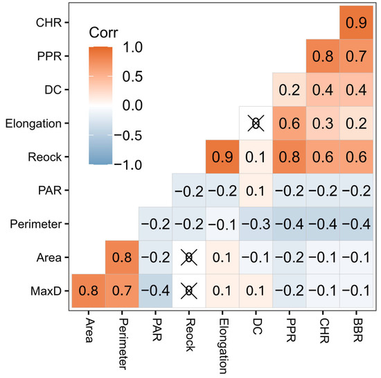 Correlations between all ten geometric metrics. Colors and numbers represent the corresponding Pearson correlation coefficients. An “×” indicates that the correlation is not significantly different from zero at the p < 0.05 significance level. For definitions of each shape metric, refer to Table 1.