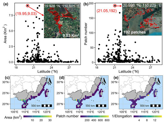 Geographic patterns of mangrove geometry characteristics. (a) Variation in mangrove area with latitude. (b) Variation in mangrove patch number with latitude. (c) Map of mangrove area distribution. (d) Map of mangrove patch number distribution. (e) Distribution map of average 1/Elongation. Insets in the top-right corners of Panels (a,b) displaying satellite images from Google Earth showing the mangrove landscapes with the largest area and the highest number of patches, respectively. Panels (a,b) are summarized using a 0.1° by 0.1° latitude–longitude grid, while Panels (c–e) use a 0.5° by 0.5° latitude–longitude grid for mapping purposes.
