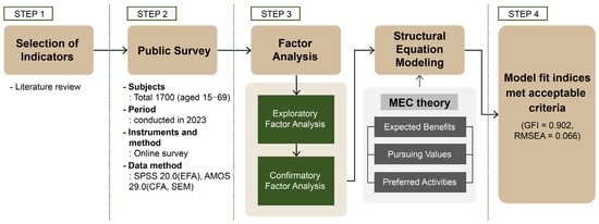 To analyze the relationship between the variables, we conducted a survey focusing on quantitative data. Confirmatory factor analysis and exploratory factor analysis were conducted to analyze the validity of the variables derived from previous studies. SEM is a complex statistical technique that allows for the analysis of relationships between multiple variables. In this study, latent variables—values, benefits, and activities—were used for the analysis. These latent variables were estimated through their respective measured variables, where values reflect individual beliefs or goals, benefits denote the positive outcomes gained from participation, and activities represent the specific behaviors people prefer to engage in.