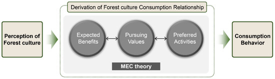 This study explores the relationship between forest culture (FC) and sustainable consumption by applying the means-end chain (MEC) theory. Compared with general products, FC products are consumed from a value consumption perspective, and their benefits have varying impacts on individuals and society. This study uses MEC theory to link the preferred attributes of FC with the expected benefits and pursued values (PVs) of FC. We (1) identified the indicators of the expected benefits of PVs and preferred activities (PAs) of FC through factor analysis, (2) examined the relationships between these factors using MEC theory, and (3) validated the factors through structural equation modeling (SEM). We surveyed 1700 Koreans to explore how FC benefits, values, and activities relate to consumer behavior. Factor analysis divided PVs into symbolic, social, and consumption values and PAs into tourism–exploration, cultural–artistic, and living–leisure activities of FC. According to SEM analysis, the contributing characteristics of FC affect the PVs and, in turn, the PAs of FC, yielding an acceptable model fit (GFI > 0.9). Thus, the concrete attitudes of consumers toward FC were categorized via abstract concepts, which influenced their practical and behavioral attitudes. In conclusion, FC products should be developed with a focus on value consumption.