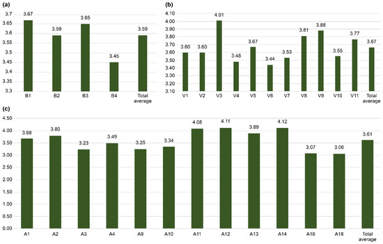 Analysis of the mean for each variable of forest culture: (a) contributed benefits, (b) pursued value, and (c) preferred activities.