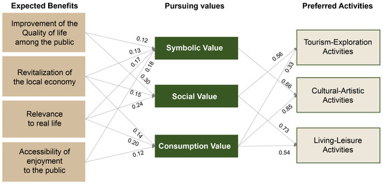 SEM analysis revealed significant pathways between the subdimensions of expected benefits, PVs, and product attributes of FC products (Figure 4). Specifically, expected benefits significantly influenced PVs, which in turn affected product attributes. The analysis indicated that the mediating factors of Symbolic Value and Consumption Value influenced all activities, while Social Value influenced only tourism–exploration activities. The subdimensions B1-improvement of the quality of life among the public, B2-revitalizing the local economy, and B3-relevance to real life had the greatest effect on tourism–exploration activities through the mediation of Social Value, while enjoyment by the public had the largest impact on living–leisure activities through the mediation of Symbolic Value. Additionally, the SEM analysis yielded acceptable model fit indices: GFI = 0.902, AGFI = 0.874, CFI = 0.882, and RMSEA = 0.066. These results suggest that the model fit the data well (Table 7).