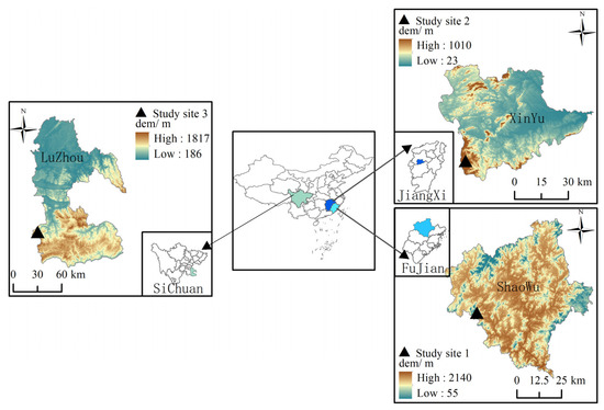 Geographical location of the study sites in subtropical China. Note: Site 1 is located at Weimin Town National Forest Farm, Shaowu City, Fujian Province; Site 2 is located at Nianzhu Forest Farm, Fenyi County, Xinyu City, Jiangxi Province; Site 3 is located at a forest farm in Minsheng Village, Luzhou City, Sichuan Province.