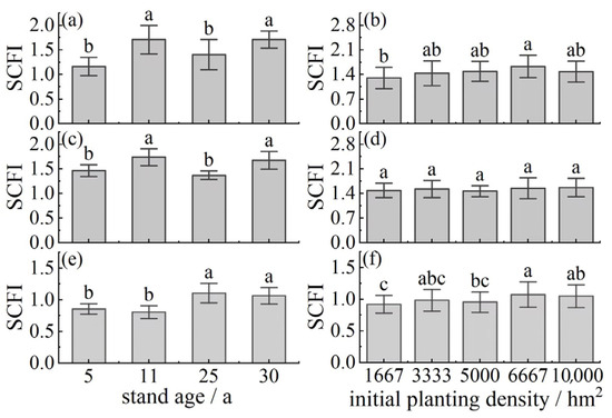 The main effects of stand age and initial planting density on the SCFI in Fujian (a,b), Jiangxi (c,d), and Sichuan (e,f) provinces. Note: different lower-case letters indicate significant differences (p < 0.05). Note: SCFI is the soil comprehensive fertility index.