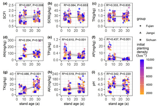Finally, structural equation models (SEMs) were used to analyze the standardized direct, indirect, and total effects of SCFI concerning stand age and initial planting density. The SEMs were analyzed using a combined dataset from three provinces and separate datasets for each province. In constructing the model, the close associations of SOM, soil mineral nutrients (including TN, AN, TK, AK, TP, and AP), and pH with soil health and plant growth were considered, and these variables were designated as mediators. Direct effects were quantified using standardized regression coefficients that link independent and dependent variables, while indirect effects were obtained by multiplying the coefficients along the indirect pathways within the model. The total effect was computed as the sum of direct and indirect effects. The SEM analysis was conducted using the “plspm” package [40]. Previous research recommends eliminating variables with factor loadings below 0.4, as this approach reduces complexity and improves model clarity, particularly in cases with small sample sizes and numerous variables [41].