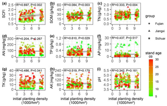 The two-way ANOVA results indicated that initial planting density significantly affected the SCFI in Fujian and Sichuan Provinces (F = 14.103, p < 0.05 for Fujian Province; F = 29.684, p < 0.001 for Sichuan Province), but had no significant effect in Jiangxi Province (F = 0.825, p = 0.516 for Sichuan Province) (Table 4). As no significant interaction effect was observed between initial planting density and stand age, the analysis focused on the main effect of initial planting density on the SCFI. In Fujian Province, SCFI was significantly higher at a planting density of 6667 trees per hectare (1.63) compared to 1667 trees per hectare (1.30) (Figure 3b). In Sichuan Province, the SCFI at 6667 trees per hectare (1.07) was significantly higher than at 5000 trees per hectare (0.95) and 1667 trees per hectare (0.92). Additionally, the SCFI at 10,000 trees per hectare (1.05) was significantly higher than at 1667 trees per hectare (0.92) (Figure 3f). In Jiangxi Province, the mean SCFI values at densities of 1667, 3333, 5000, 6667, and 10,000 trees per hectare were 1.49, 1.53, 1.47, 1.55, and 1.57, respectively, with no significant difference observed between initial planting densities (Figure 3d). The linear mixed-effects model (Model 1) revealed that initial planting density significantly and positively influenced the SCFI (β = 0.02 **, 95% CI = 0.01, 0.03) and the soil fertility factors SOM (β = 0.60 **, 95% CI = 0.20, 1.00), TN (β = 0.02 **, 95% CI = 0.01, 0.03), and TP (β = 0.01 *, 95% CI = 0.00, 0.02) (Figure 5a–c).