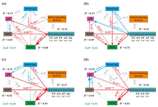 Structural equation models of relationships among stand age, initial planting density, soil fertility factors, and the SCFI. Subfigures illustrate the results in different regions: the combined region (a), Fujian Province (b), Jiangxi Province (c), and Sichuan Province (d). Solid arrows indicate significant effects (red: positive, blue: negative), and dashed arrows denote pathways without significant impact. Significance levels: * represents p < 0.05; ** represents p < 0.01; *** represents p < 0.001. The numbers along the arrows are standardized path coefficients. The marginal R2 values of the SCFI with stand age and initial planting density are presented. Note: As defined in Table 1 and Figure 2. Significant p-values are indicated as follows: * p < 0.05; ** p < 0.01; *** p < 0.001.