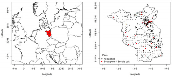 Location of the state of Brandenburg (red) in Central Europe (left). Plot locations in the state of Brandenburg, Germany (right). Hollow circles refer to plots where tree height data was used for analysis; red dots refer to unmanaged plots specifically used for forest stand growth analysis.