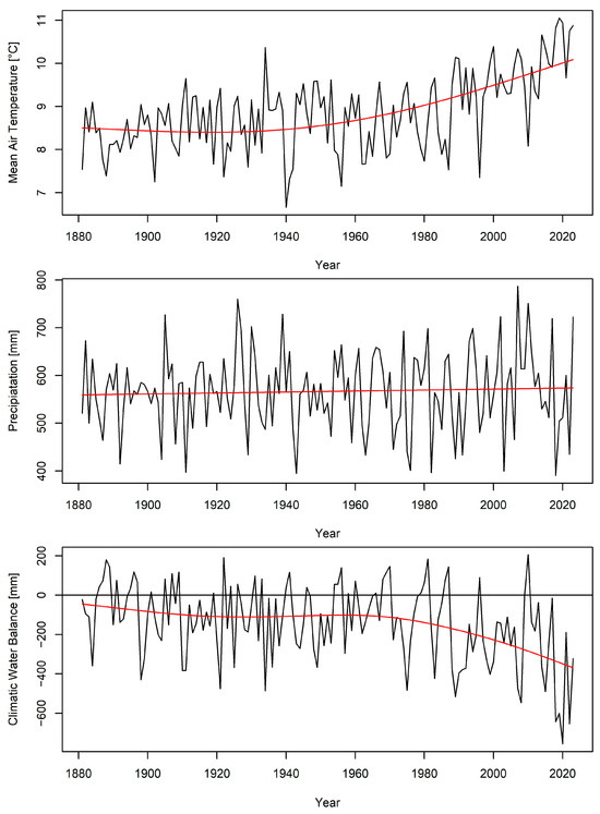 Development of mean annual temperature, total annual precipitation, and annual climatic water balance averaged for the state of Brandenburg, Germany, from 1880 to 2024 (black lines). Red lines show a thin-plate regression spline model.