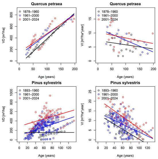 Standing volume VD [m3/ha] (left) and volume increment VI [m3/ha*year] (right) over tree age for Sessile oak (Quercus petraea) (top) and Scots pine (Pinus sylvestris) (bottom). Red, blue, and black refer to different time periods used for circles and lines. Lines indicate linear trend models for each time period and species.