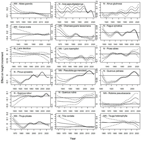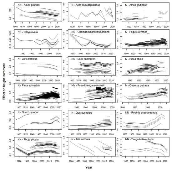 The tree species were selected based on the available tree height increment measurements, setting the minimum at 700 individual height measurements per species. Nine of the tree species in our analysis are considered non-native, as they were introduced into the study area at the end of the 19th century [17]. Classification of native (N) and non-native (NN) tree species is provided in Table 1.