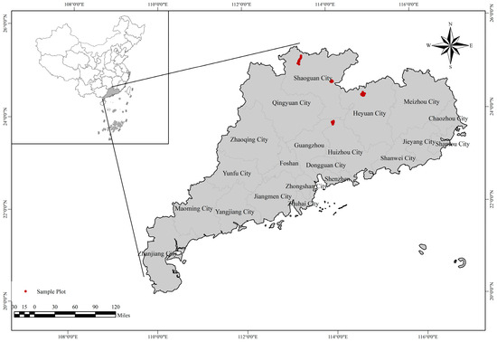 The study area is situated in the central and northern regions of Guangdong Province, China (20°13′–25°31′ N, 109°39′–117°19′ E; Figure 1), and includes Shaoguan, Huizhou and Heyuan, with an area of 48,700 square kilometers. Their climate type belongs to the East Asian monsoon zone, with an average precipitation of 1798.8 mm and an average annual temperature of 22.1 °C. These three regions exhibit a diverse topographical landscape characterized by a variety of landforms, including mountains, hills, plateaus, and plains. The region has a well-developed water system, including important rivers such as the Pearl River, the Xijiang River and the Beijiang River, as well as numerous tributaries, lakes and reservoirs, making it an important water resource base in Southern China. Vegetation types in this region mainly include tropical rainforests, evergreen broad-leaved forests and coniferous forests, which are distributed at different altitudes. According to the latest (9th) Forest Resources Inventory, Guangdong Province has a total forest area of 10,535,400 hectares, with a forest coverage rate of 58.59%, and Chinese Fir is the dominant tree species in this region.