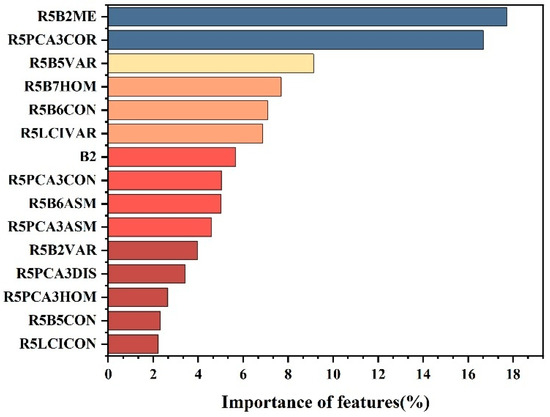 The images were pre-processed utilizing ENVI 5.3, from which three categories of remote sensing variables were derived from Landsat 8 OLI images: spectral features, vegetation indices and texture features. Spectral features represent the fundamental and most straightforward characteristics in remote sensing imagery. Nonetheless, the occurrence of “different spectra for identical objects and identical spectra for disparate objects” is prevalent in remote sensing data, which complicates the attainment of accurate estimation outcomes when solely depending on spectral features [41,42]. Vegetation index is essentially a multi-band reflectance transformation, which can make the transformed data highlight the vegetation information and weaken the non-vegetation feature information, so it can better reflect the growth conditions of the vegetation and spatial distribution of the location compared to the spectral features. Texture features take into account the spatial relationships among pixels, which can effectively represent variations in grayscale within an image and enhance the recognition of spatial information. Consequently, the integrated application of the three categories of remote sensing factors can more accurately capture the characteristics of features and their transformations [43,44]. In the present study, we identified a total of 121 remote sensing factors, comprising 7 spectral features, 7 vegetation indices, 3 information enhancement factors, and 104 texture features (Table 2). Subsequently, we employed RF to filter the importance of remote sensing factors. Finally, we selected the factors exhibiting high significance for model construction, which primarily included 1 spectral feature and 14 texture features (Figure 2).