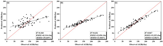 Scatter plots illustrating the predictive accuracy of AGB estimation models utilizing the KNN, GBRT and RF methodologies are shown in Figure 3. The data presented in the Figure indicate that, under identical modeling conditions, the KNN model exhibited the least favorable performance, achieving an R2 of 0.368 and a RMSE of 42.314 t/ha. The GBRT model ranked second, with an R2 of 0.636 and an RMSE of 32.056 t/ha. In contrast, the RF model demonstrated superior performance, attaining an R2 of 0.867 and an RMSE of 19.325 t/ha. When compared to the KNN and GBRT models, the RF model showed an improvement in R2 of 0.499 and 0.231, respectively, while the RMSE was reduced by 22.989 t/ha and 12.731 t/ha, respectively. Furthermore, an analysis of the predicted and observed values across various models reveals a notable tendency for KNN and GBRT to exhibit a significant overestimation of low values and underestimation of high values. The lowest measured value is 21.942 t/ha, while the highest is 277.09 t/ha. The lowest prediction value based on the KNN model is 70.487 t/ha and the highest is 143.022 t/ha, with a large range, and there are obvious saturation characteristics. While the corresponding GBRT model-predicted values are 60.368 t/ha and 189.963 t/ha, these two models of the relative error between the groups of data are larger. The issue of low values associated with the overestimation and underestimation of high values in the RF model has been notably enhanced, yielding predicted values of 50.946 t/ha and 223.989 t/ha, respectively. The relative errors among the various data groups are minimal, indicating that the RF model demonstrates superior estimation accuracy.