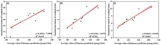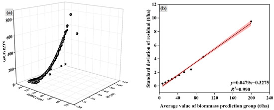 where is the difference between the predicted and measured values, is the observed biomass value and is the biomass prediction model. The uncertainty associated with the variation in model residuals can be quantified through the standard deviation of the residuals. According to the relevant study [53], the standard deviation of the residuals exhibits a linear correlation with biomass. Consequently, the uncertainty associated with the variation in model residuals can be determined by establishing a linear relationship between the standard deviation of the residuals and biomass. The corresponding formula is presented below: