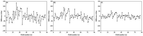 Table 4 presents the comprehensive uncertainty associated with the remote-sensing-based estimation of AGB for Cunninghamia lanceolata. By integrating the plot scale uncertainty with the uncertainty derived from the remote sensing model, as outlined in Equation (19), we determined the total uncertainties to be 15.22%, 7.08% and 6.75% for the KNN, GBRT and RF models, respectively.