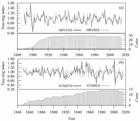 The HBY chronology spans 127 years, covering the period from 1889 to 2015, while the NTM chronology is 168 years, covering the interval from 1849 to 2016. The ranges of mean values and mean sensitivities of the chronologies are 0.976–0.993 and 0.133–0.180, respectively (Table 1). The values of the signal-to-noise ratio (SNR), the expressed population signal (EPS), and the variance of the first principal component are all lower in the standard chronology than in the residual chronology (Table 1) [30]. The EPS value 0.744 of HBYSTD is relatively low, but there is a significant correlation (r = 0.84, p < 0.01) between the HBYSTD and HBYRES chronologies (with an EPS 0.896 for HBYRES). Especially during the period from 1902 to 2014, both HBYSTD and HBYRES show a highly consistent pattern of variation (Figure 2). The subsequent correlation analysis is also based on a sufficient sample size. Therefore, to ensure the reliability of the analysis, a minimum of 5 cores was selected as the threshold [32], resulting in effective chronologies for HBY from 1902 to 2015 and for NTM from 1871 to 2016.