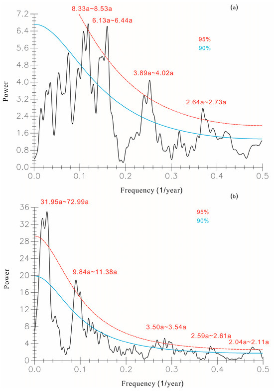 Cycles for (a) Huangbaiyuan standard chronology (HBYSTD) and (b) Nantianme standard chronology (NTMSTD).